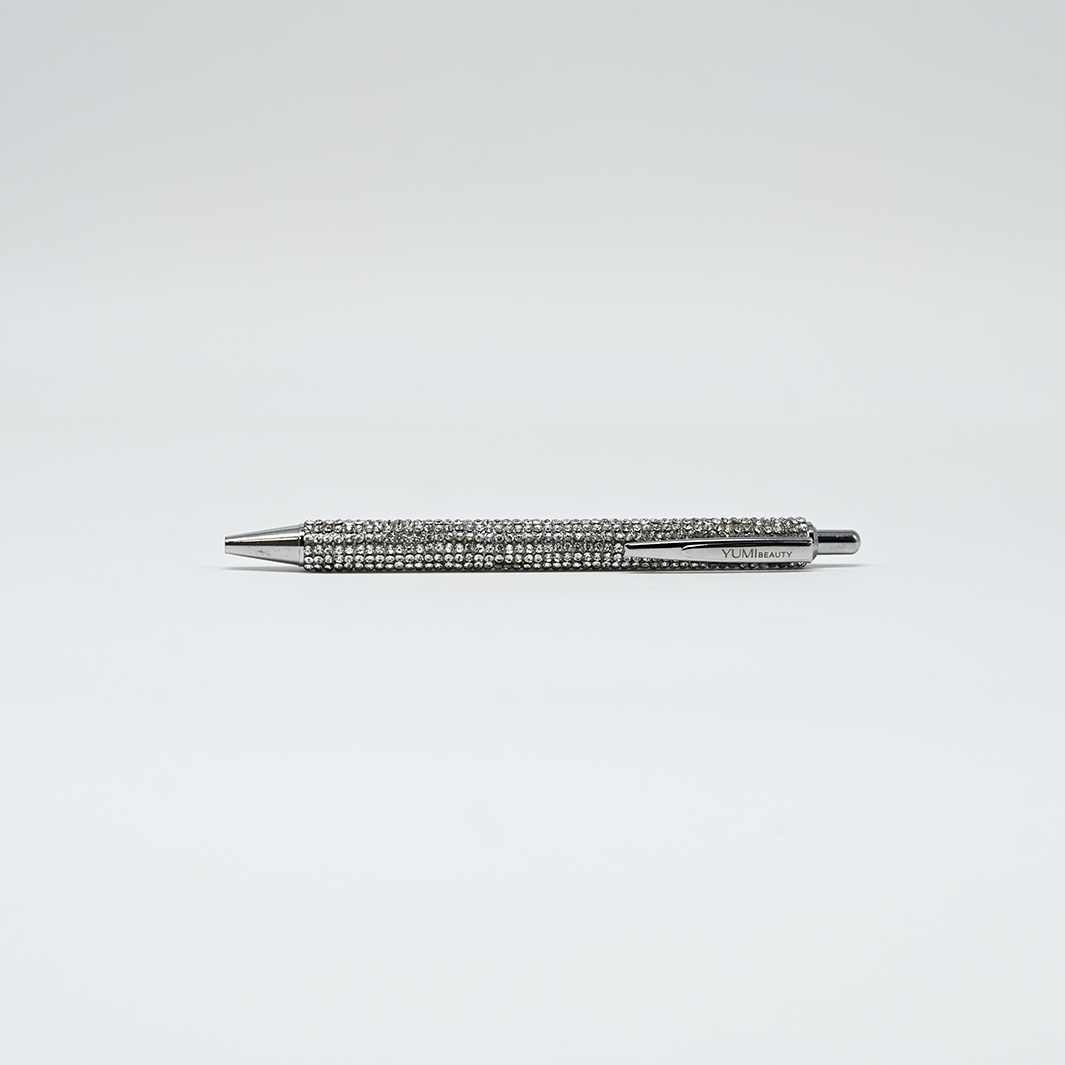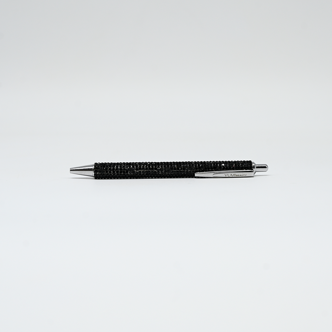 Stylo YUMI Beauty à strass, simple et élégant, pour écrire avec une touche de style, disponible en noir ou argent.